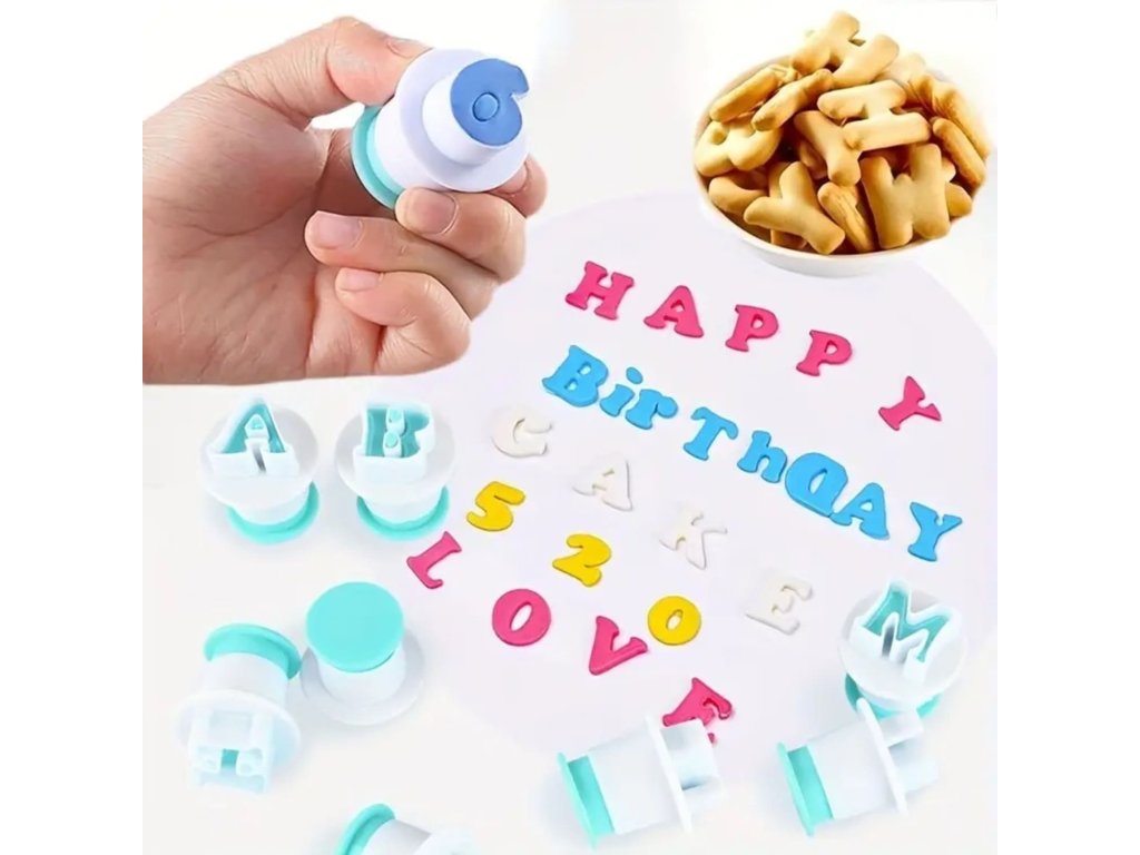 Sada plastových vykrajovačiek s piestikom, vyrobená z pevného plastu.