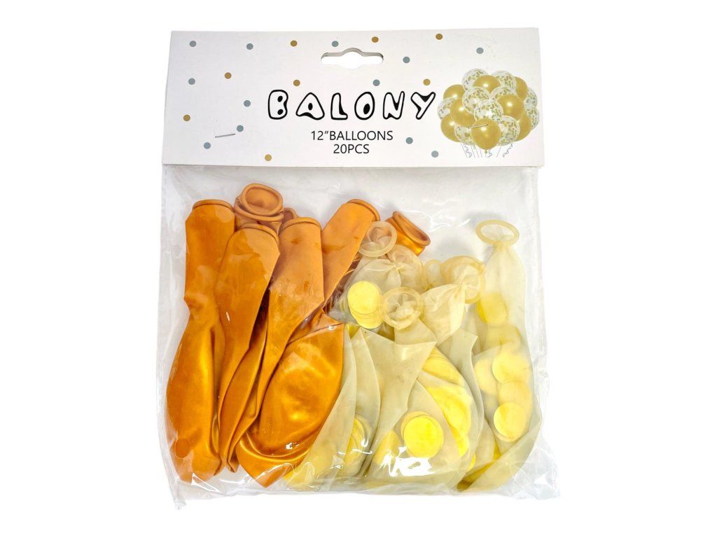 Balónová kytica pozostáva zo zlatého mixu 20 latexových balónov: 10 ks priehľadné balóny so zlatými okrúhlymi konfetami + 10 ks zlatých balónov.