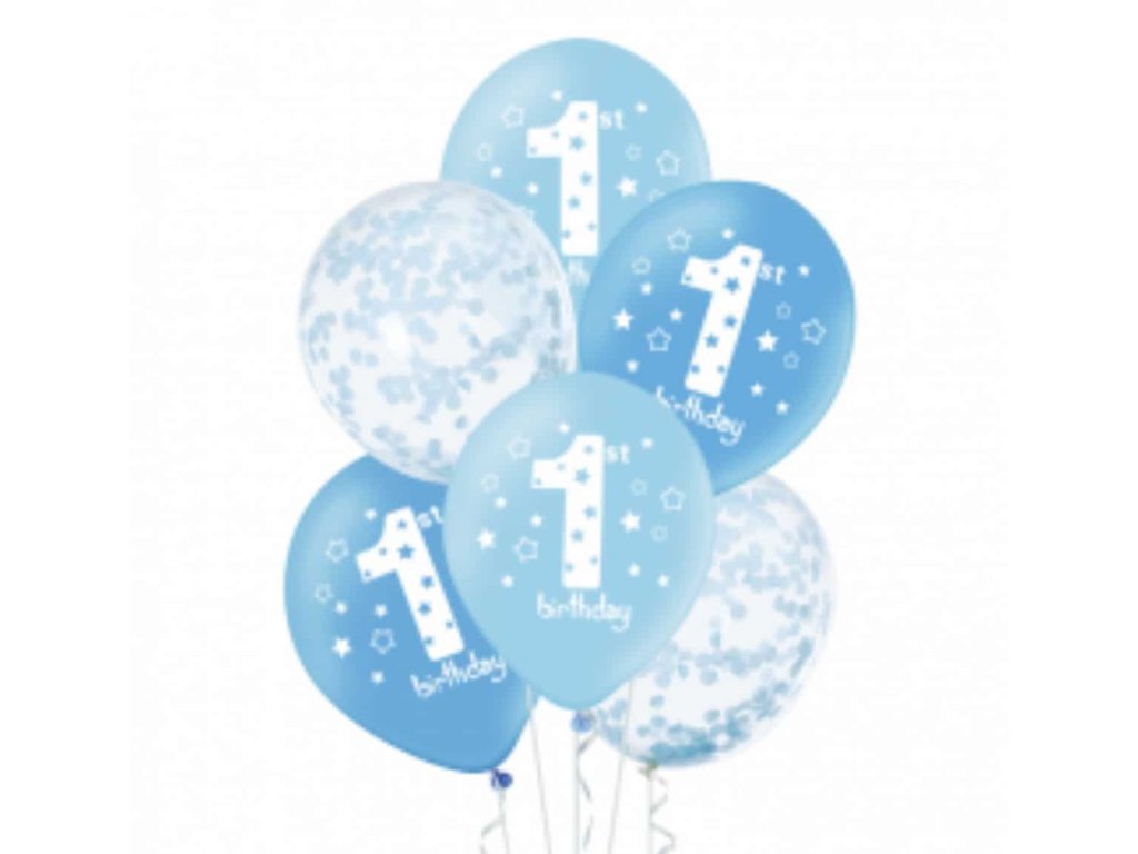 Balónová kytica pozostáva zo 6 modrých latexových balónov: 2 ks priehľadné s modrými bodkami + 2 ks tmavo modré s číslom 1 + 2 ks svetlo modré s číslom 1.