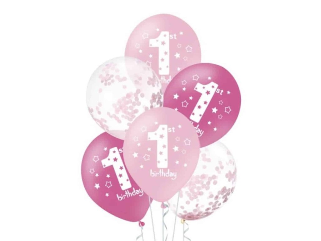 Balónová kytica pozostáva zo 6 ružových latexových balónov: 2 ks priehľadné s ružovými bodkami + 2 ks tmavo ružové s číslom 1 + 2 ks svetlo ružové s číslom 1.