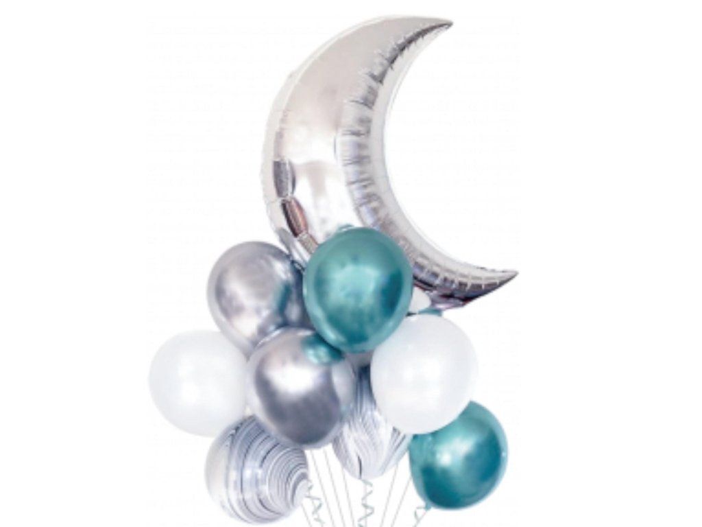 Sada obsahuje: 1 fóliový balónik mesiac (70 cm), 8 farebných latexových balónov (30 cm).