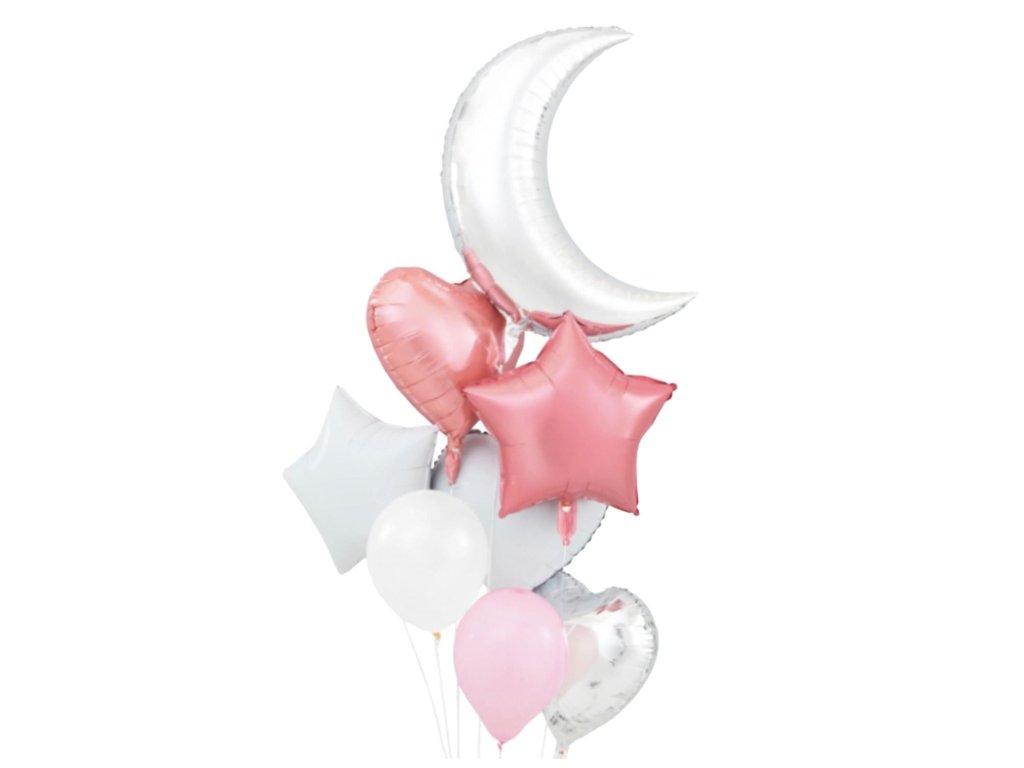 Sada obsahuje: 1 fóliový balónik mesiac (70 cm), 5 fóliových balónikov hviezdičky a srdiečka (45 cm) a 2 latexové balóny (30 cm).