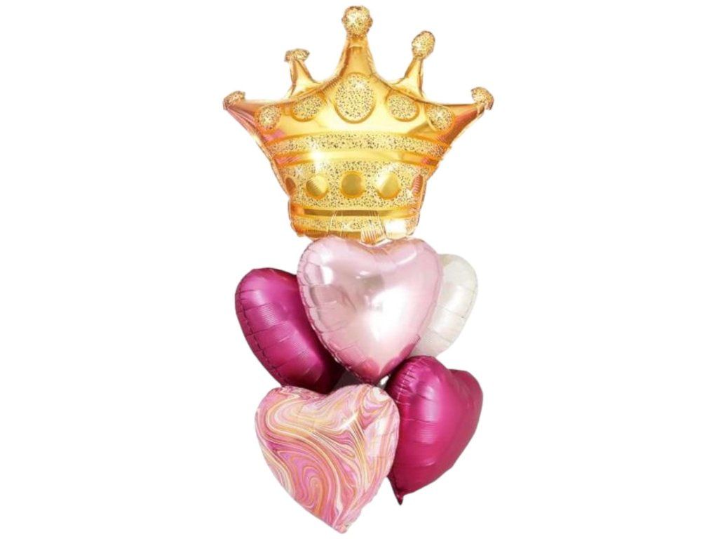 Sada obsahuje: 1 fóliový balónik korunka 74 x 77 cm, 5 fóliových balónov srdiečka 45 cm.