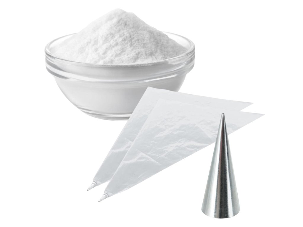 Obsahsady: tenká zdobiaca špička+cukrárske vrecká na zdobenie 2x + kráľovská glazúra 100 g.