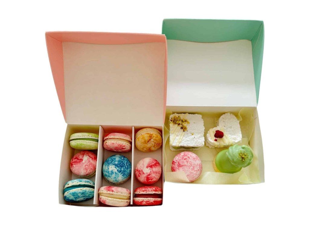 Dodávaná v plochom stave, ku zloženiu nie sú potrebné žiadne lepiace pomôcky. Krabička je ľahko zložiteľná. Súčasťou balenia je aj kartónový rozdeľovač na makrónky.