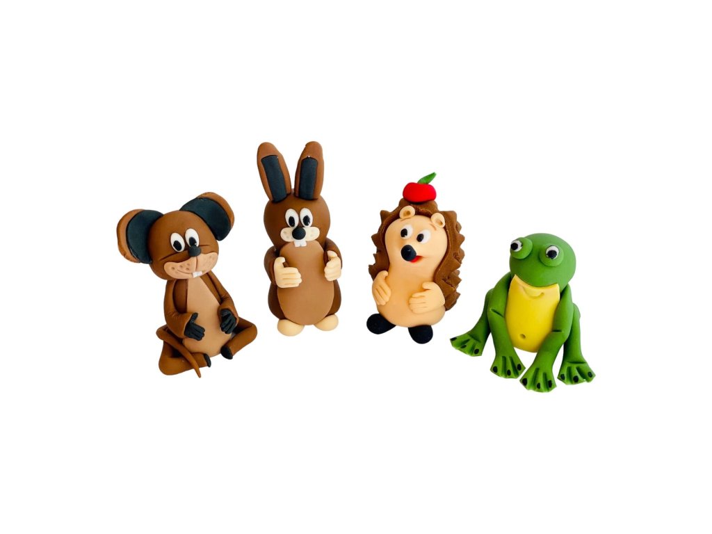 Sada dekorácii na tortu, vyrobená z modelovacej hmoty Smartflex Velvet.Sada obsahuje 4 ks figúrok v rozmere: zajko, myška, žabka, ježko 5 cm (výška).