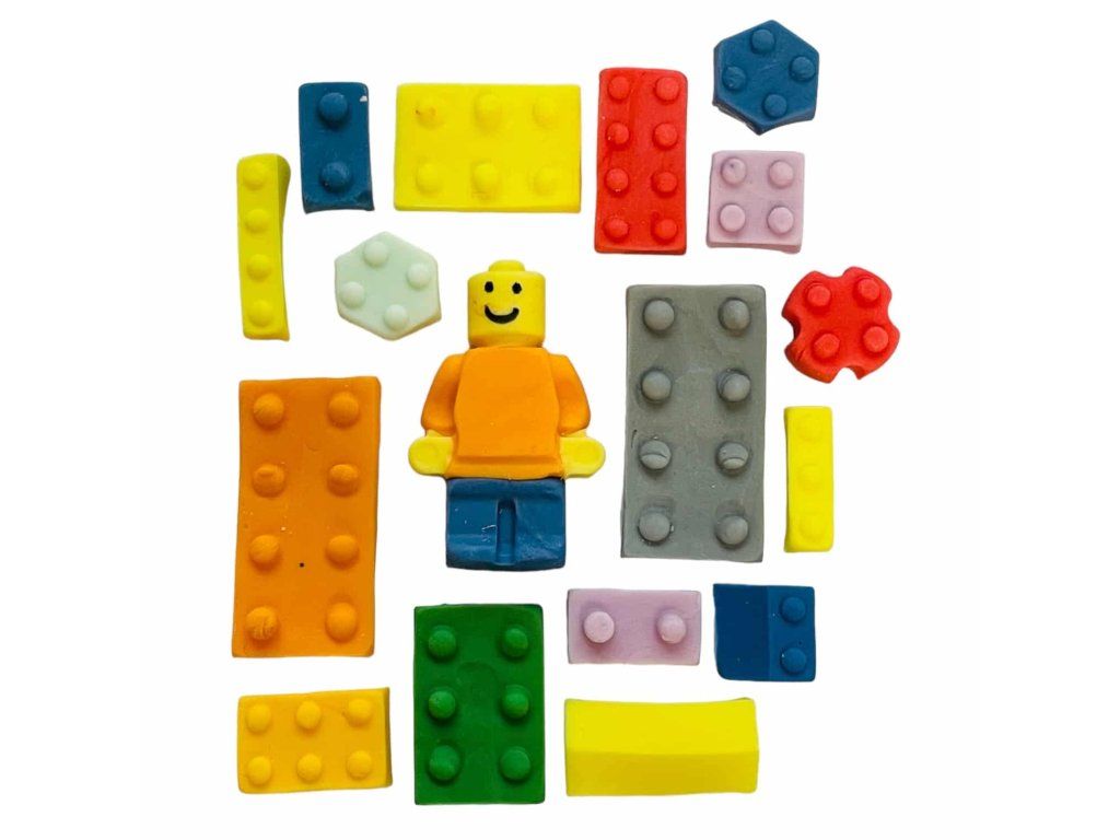 Sada dekorácii na tortu, vyrobená z modelovacej hmoty Smartflex Velvet.Sada obsahuje 16 ks figúrok v rozmere: 15 kusov farebných kociek LEGA od 1-4 cm (dĺžka), panáčik 4,5x3 cm (vxš).