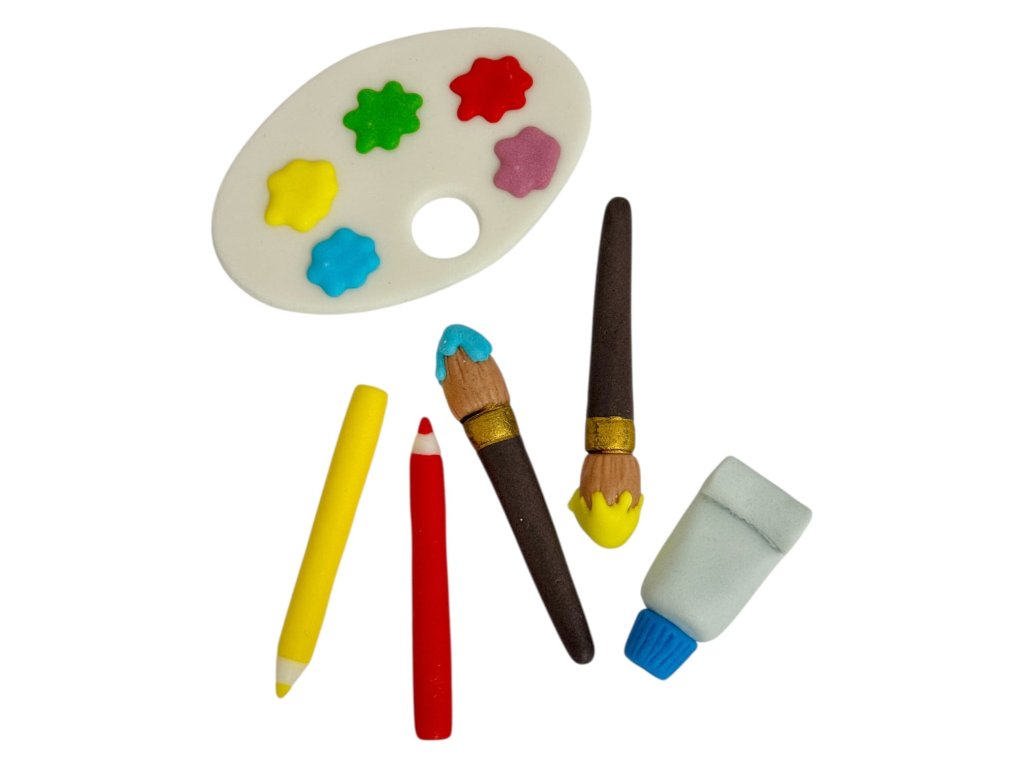 Kreatívna dekorácia, ktorá poteší všetkých malých aj veľkých umelcov. Tento detailne prepracovaný set obsahuje maliarsku paletu s farebnými "farbami", štetce, ceruzky a tubu s farbou.Sada obsahuje 6 ks figúrok v rozmere: paletka 11 cm, štetce 2 ks 9 cm (dĺžka), pastelky 2 ks 8 cm (dĺžka), tubička farby 5 cm (dĺžka).