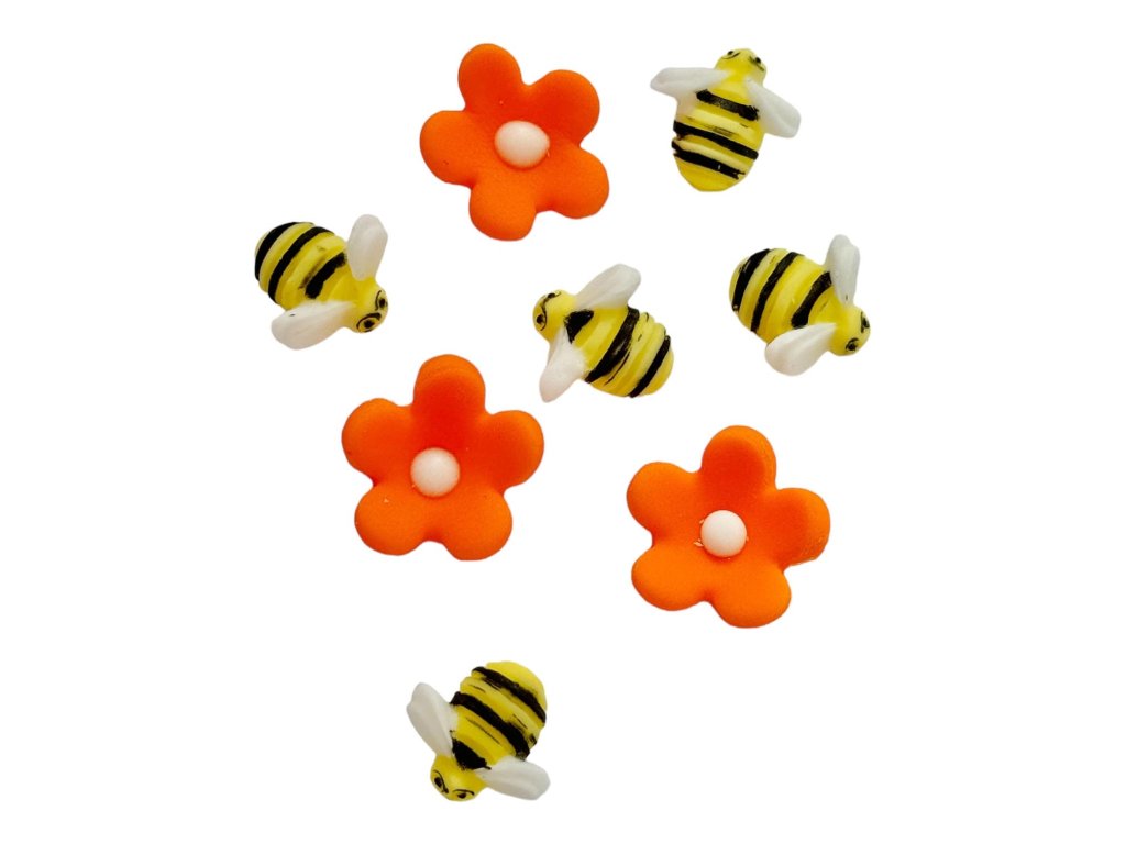 Sada dekorácii na tortu, vyrobená z modelovacej hmoty Smartflex Velvet.Sada obsahuje 8 ks figúrok v rozmere: kvietky 3 ks (2,5 cm priemer), včielky 5 ks (1,5 cm dĺžka).