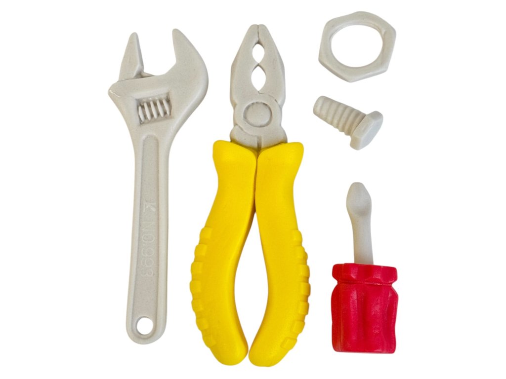 Sada dekorácii na tortu, vyrobená z modelovacej hmoty Smartflex Velvet.Sada obsahuje 5 ks figúrok v rozmere: kliešte 14,5 cm (dĺžka), kľúč 14 cm (dĺžka), šraubovák 7 cm (dĺžka), 2 ks šrauby 2,5 cm (dĺžka).