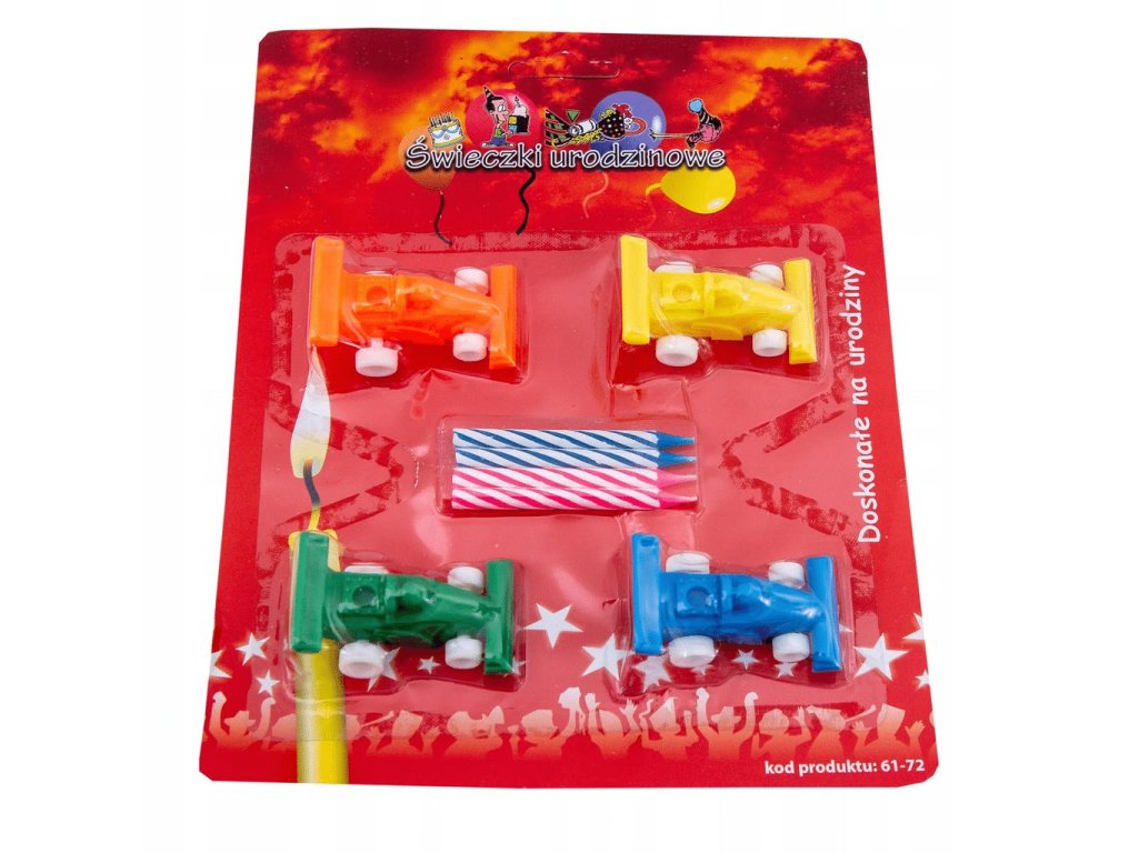 Sada tortových sviečok pre chlapca. Ideálna na slávnostné okamihy, ako sú narodeniny, detské oslavy a tematické párty.Sada obsahuje: 4 ks plastových nadstavcov v tvare formule + 4 ks sviečok.