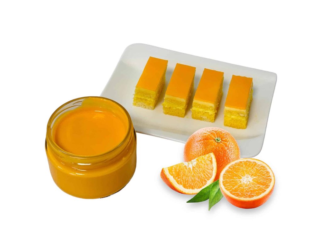 Hotová kvalitná cukrárska poleva s príjemnou pomarančovou chuťou. Môže sa použiť na poliatie tortového korpusu, rolády, cukroviniek a mnoho ďalších druhov sladkého pečiva. Veľmi dobre sa s ňou pracuje, ľahko sa nanáša a povrch je dokonale hladký.Na fotke sú poliate sanquickové pomarančové rezy.