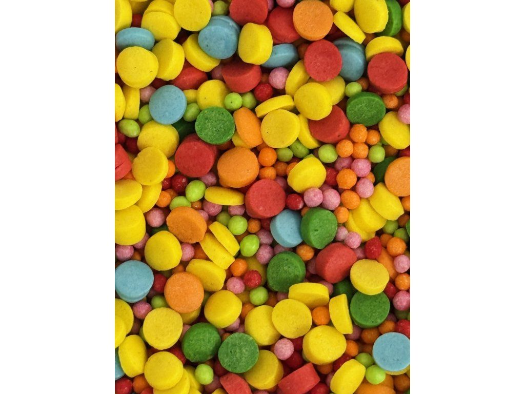 Zloženie: cukor, pšeničná múka, škrobová melasa, kapolová glazúra (E425), suchý mastenec E553b, potravinárske farbivo: E110, E102, E124.