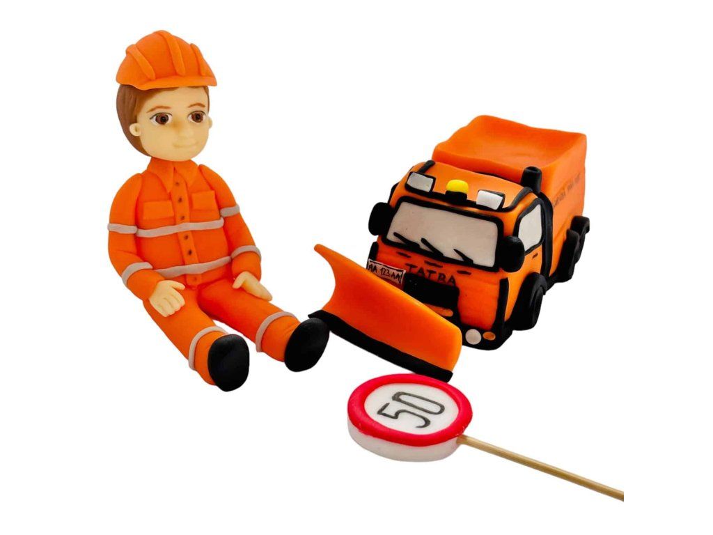 Dekorácia na tortu, vyrobená z modelovacej hmoty Smartflex Velvet. Figúrky na objednávku vyhotovujeme s dlhšou dodacou dobou 10-14 pracovných dní (dovoľujeme si Vás upozorniť víkend nieje rátaný, ako pracovný deň).Sada obsahuje 3 ks figúrok v rozmere: pluhár 8 cm (výška), auto 8 cm (dĺžka), značka 4 cm (priemer). Po telefonickom dohovore vieme upraviť rozmer podľa Vašich predstáv (0908 897 545).