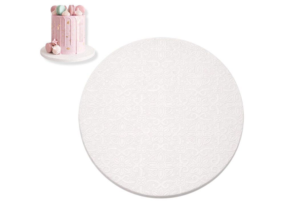 Okrúhla tortová podložka z kartónu potiahnutá zlatou hliníkovou fóliou.