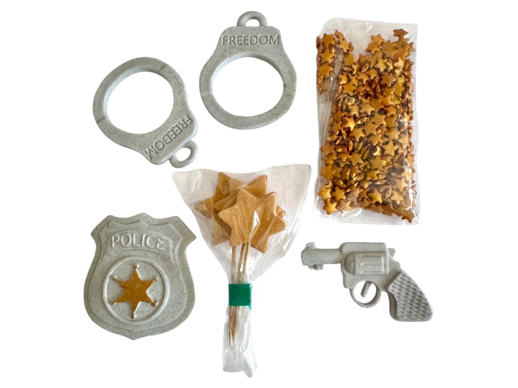 Sada dekorácii na tortu, vyrobená z modelovacej hmoty Smartflex Velvet.Sada obsahuje figúrky v rozmere: putá 2 ks 5 cm (priemer), pištoľ 6,5 cm (dĺžka), 3 ks hviezdičiek na špáradle od 4,5 do 3 cm (priemer), policajný odznak 5,5 cm (dĺžka), súčasťou balenia je aj sada posýpky v tvare hviezdičiek 20 g.