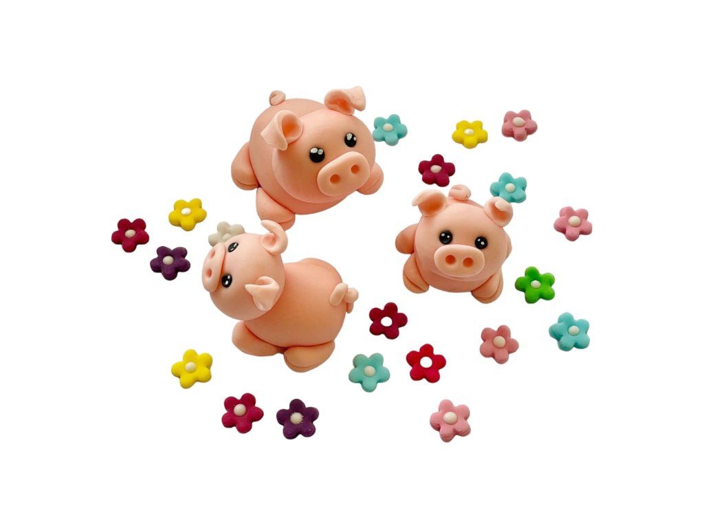 Sada dekorácii na tortu, vyrobená z modelovacej hmoty Smartflex Velvet.Sada obsahuje 3 ks figúrok aj s malými kvietkami v rozmere: veľké prasiatko 4,5x5x4x5 cm (šxvxd), malé prasiatko 3x4x3,5 cm (šxvxd), balenie 20 ks farebných kvietkov s priemerom 1,5 cm.
