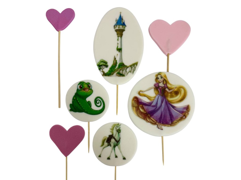 Vytvor čarovnú rozprávkovú tortu s krásnou Rapunzel sadou jedlých dekorácií. Motív princeznej s dlhými zlatými vlasmi, zámku a kúzelných detailov prinesú na oslavu kúzlo Disney rozprávky Na vlásku.Sada obsahuje 7 ks 2D fondánových zápichov v rozmere: motívy rozprávky 4 ks od 9 cm do 6 cm, srdiečka 3 ks od 6 do 4 cm.