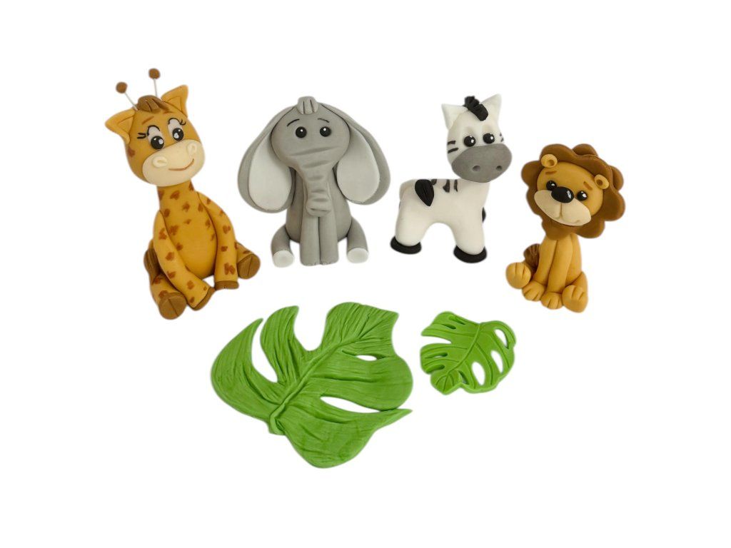 Sada dekorácii na tortu, vyrobená z modelovacej hmoty Smartflex Velvet. \n \nSada obsahuje 4 ks figúrok aj s listami v rozmere: sloník 5×6,5 cm cm (šxv), žirafa 5×10×6 cm (šxvxh), levík 3,5×6 cm (šxv), zebra 7,5x4x5 (šxvxh), mix listy 2 ks (od 5 cm do 3 cm). \n \nZloženie: cukor, glukózový sirup, pitná voda, rastlinné tuky (kokosový tuk, hydrogénový olej z palmových jadier), škrob (jedlý zemiakový škrob), xanthanová guma, arómy, konzervant (sorban draselný),regulátor kyslosti (kyselina citrónová). \n \nZloženie možných farbív: glukózový sirup, zvlhčovadlo: E422, voda, cukor, farbivá E102, E129, E122, E133, E110, E153, škrob, E330, E331, E406, E202. \n \nFarbivá E102, E129, E122, E110 môžu mať nepriaznivý vplyv na pozornosť a činnosť u detí. \n \nVýživové hodnoty na 100 g: energia 1641 kJ/388 kcal, tuky 6,26 g (z toho nasýtené 5,29 g), sacharidy 82,41 g (z toho cukry 73,23 g), vláknina 0,99 g, bielkoviny <0,2 g, soľ <0,03 g. \n \nFigúrky môžu obsahovať nejedlé časti ako napr. špáradlá. \n \nDoporučované skladovanie: na suchom, tmavom mieste, pri teplote 16-23°C. \n \nDátum spotreby je uvedený na obale. \n \nVýrobca: Iveta Gereková, Štefániková 212, 02901, Námestovo, Slovensko, www.cukrarskedekoracie.skBuďte prvý, kto napíše príspevok k tejto položke.