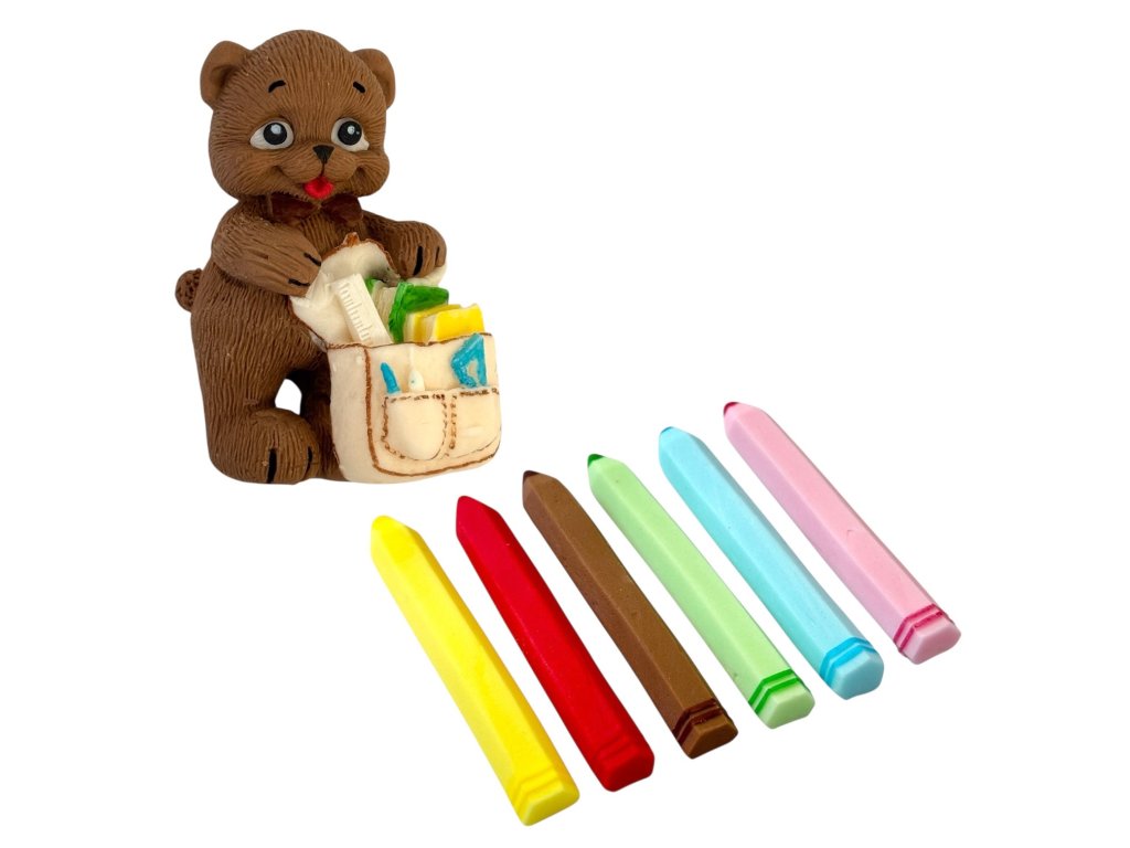 Sada dekorácii na tortu, vyrobená z modelovacej hmoty Smartflex Velvet.Sada obsahuje 7 ks figúrok v rozmere: pastelky 5 ks 8,5 cm (dĺžka), macko 7×4,5 cm (dxš).