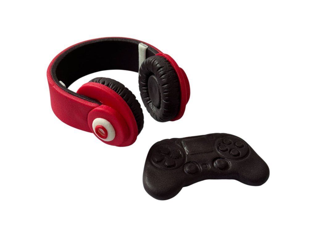 Sada dekorácii na tortu, vyrobená z modelovacej hmoty.Ozdobte svoju tortu originálnou cukrovou sadou, ktorá kombinuje štýlové slúchadlá a herný ovládač! Táto detailne ručne vyrobená sada z kvalitnej cukrovej hmoty je ideálna pre milovníkov hudby a hier. Dodá vašej torte moderný a zábavný nádych, ktorý ocenia všetci fanúšikovia hier.