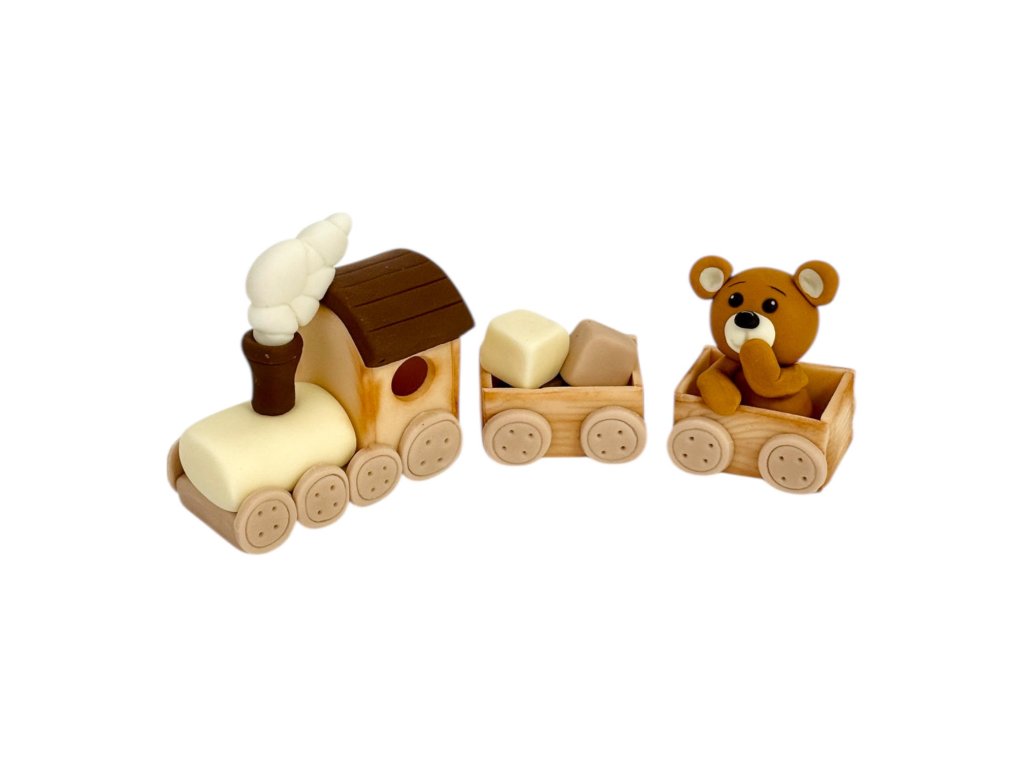 Vláčik, ktorý dodá detskej torte hravosť a príbeh. Prírodné tóny a detailne spracovanie.Dekorácia na tortu, vyrobená z modelovacej hmoty Smartflex Velvet.