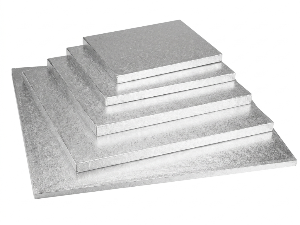 Hranatá tortová podložka z kartónu potiahnutá striebornou hliníkovou fóliou.